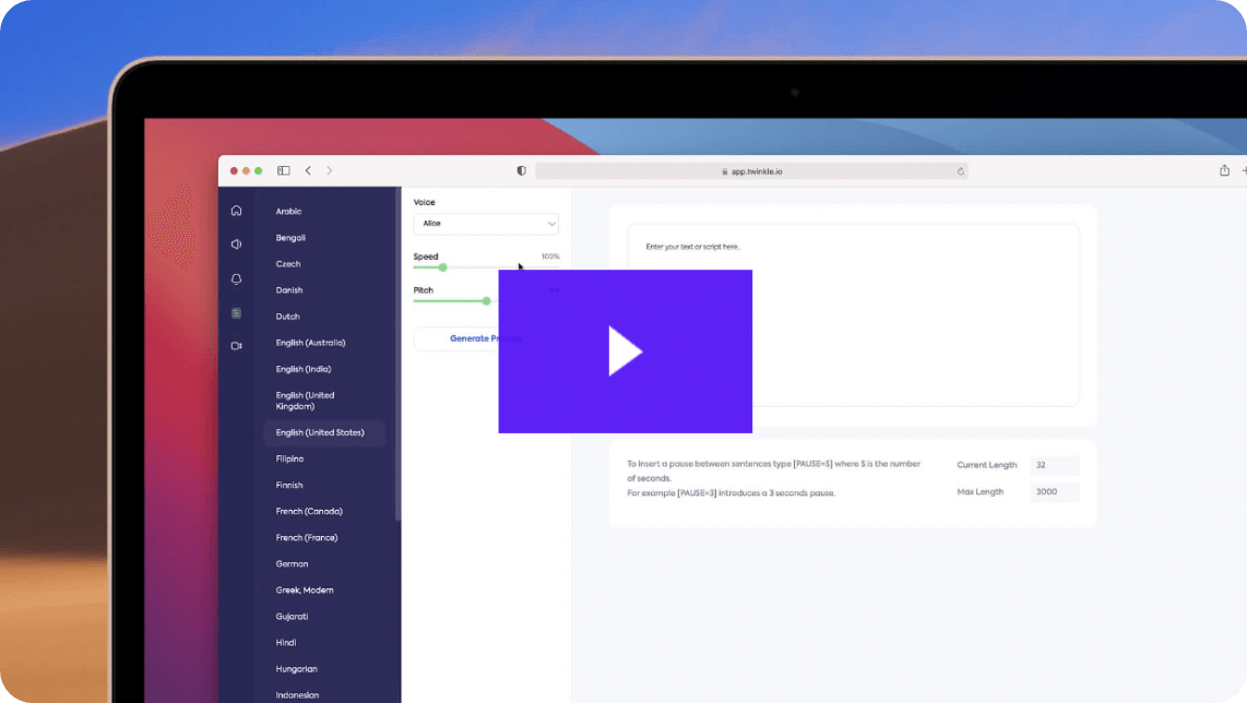 Now you can easily create your own voiceovers using our text to speech creator built with over 30 languages, & 70+ voices to choose from! Adjust the speed, pitch & add pauses in seconds.